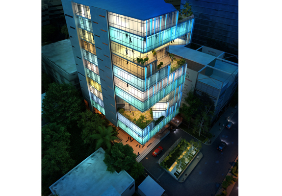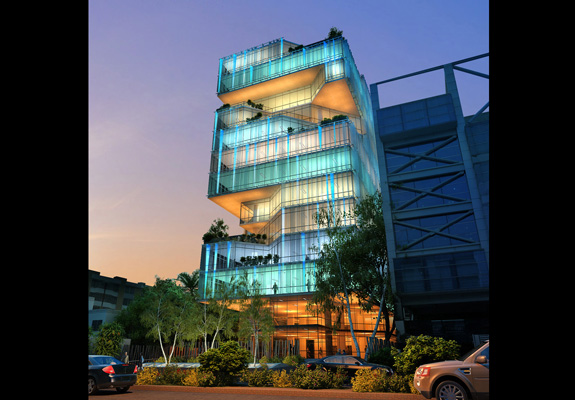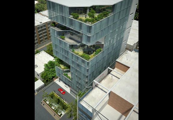 The Nassa Diamond is a thirteen storied office building, situated at the coalesced area of Gulshan, in the midst of concrete urban fabric on a linear site. The sculptural glass form derived has been perceived out of a box. The concept of vertical green has been utilized in terraces to sedate the work environment from the intense west sun light and mollify the effect of surrounding concrete jungle. The form created has multiple heights of terrace shading encompassing capacious volumes of space, framing vistas, which with the daylight and green acquire a delightful ambience of indoor outdoor relationship. This design phenomenon serves as a void of urban relief in the compact urban texture and provides breathing space for the pedestrians.